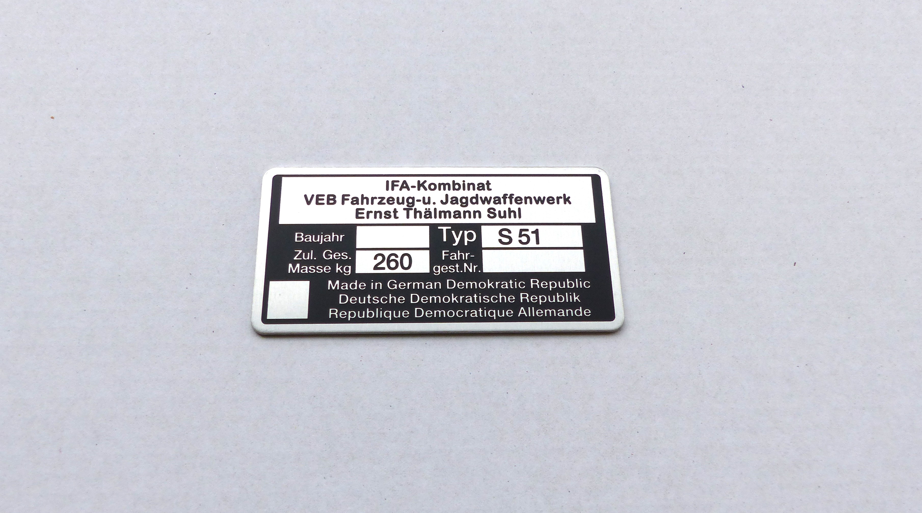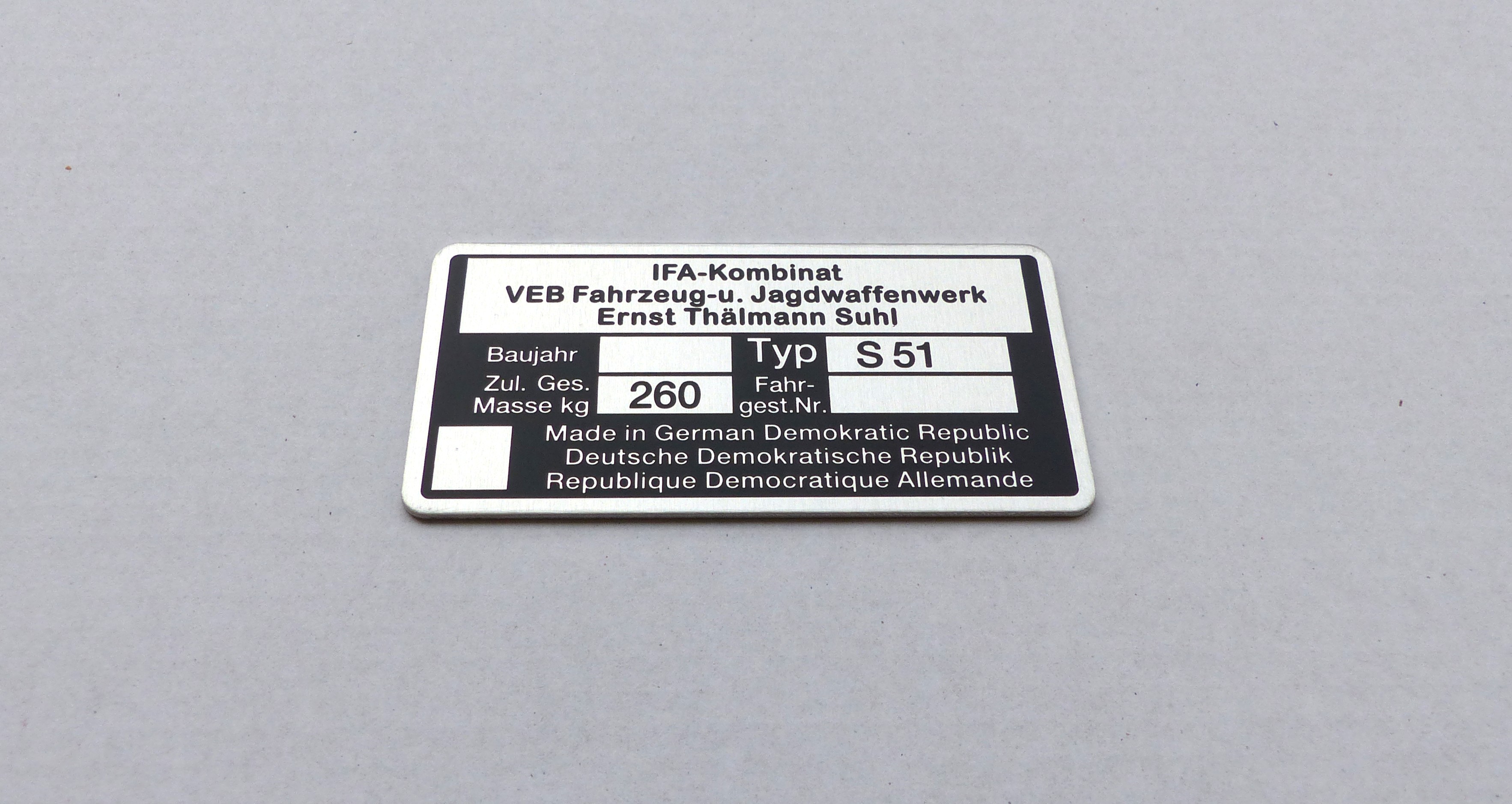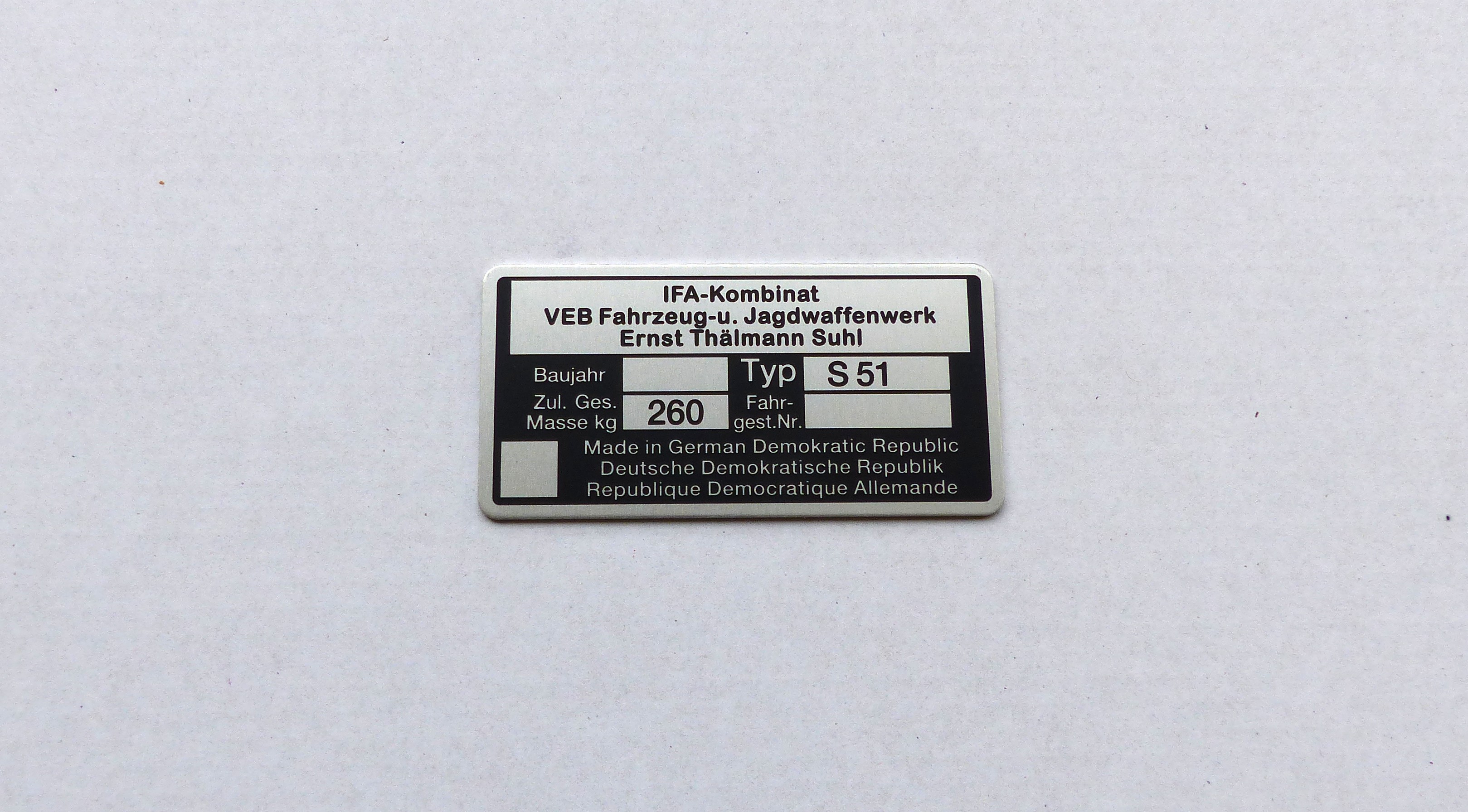 Angeboten wird ein geätztes Typenschild passend für die Simson S51 aus Aluminium mit den Feldern: