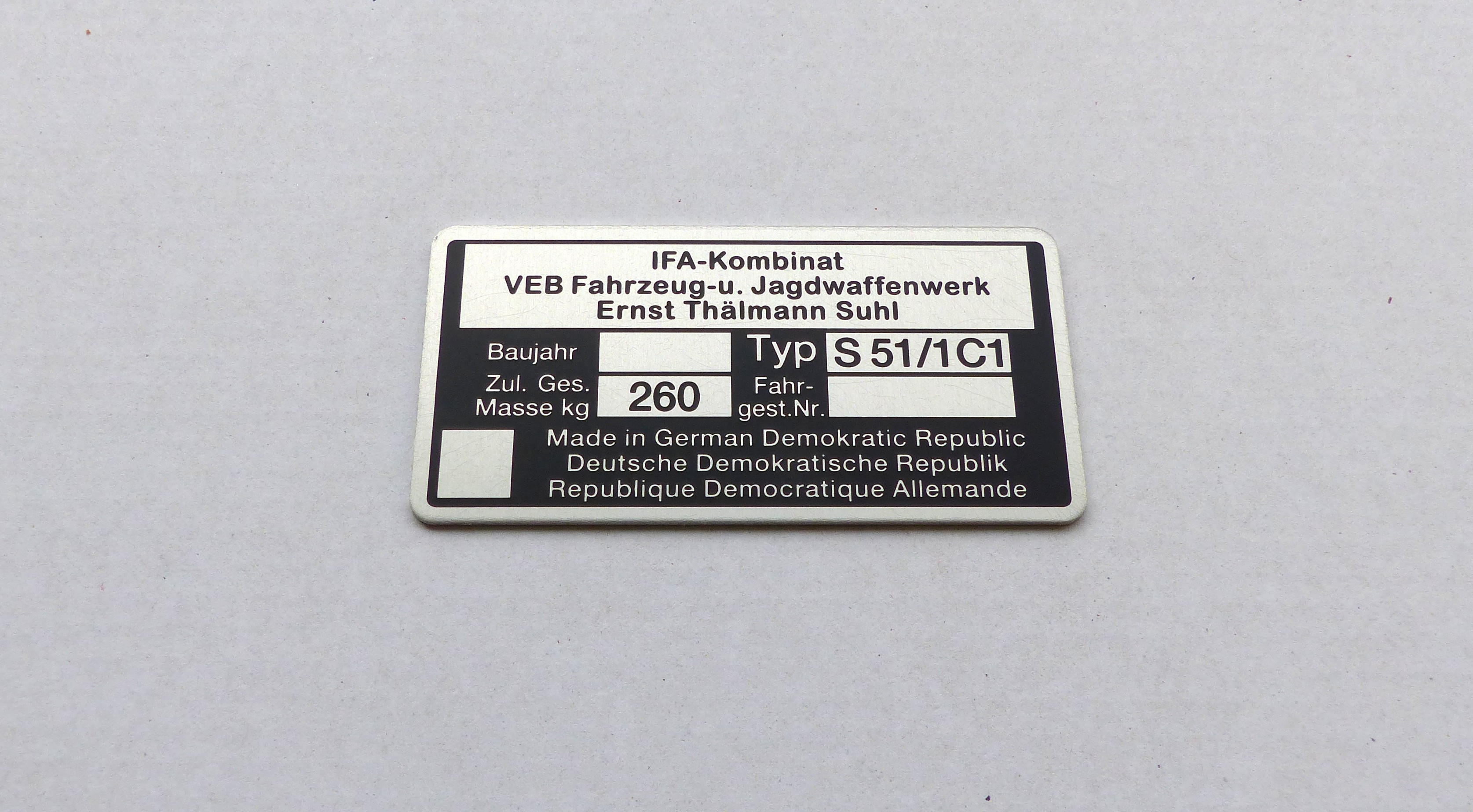 Das Typenschild ist eine Neuanfertigung mit dem Ziel eine hochwertige Alternative zum Original DDR Typenschild anzubieten.