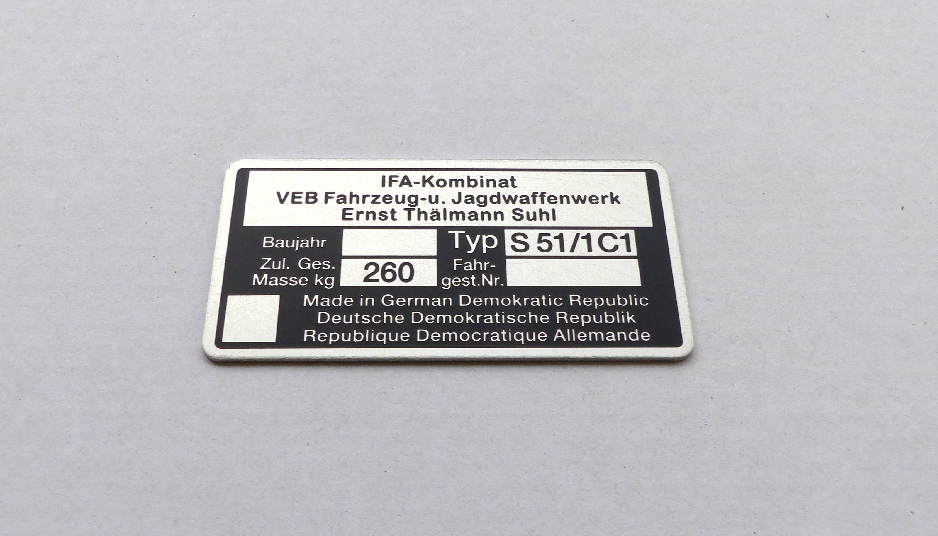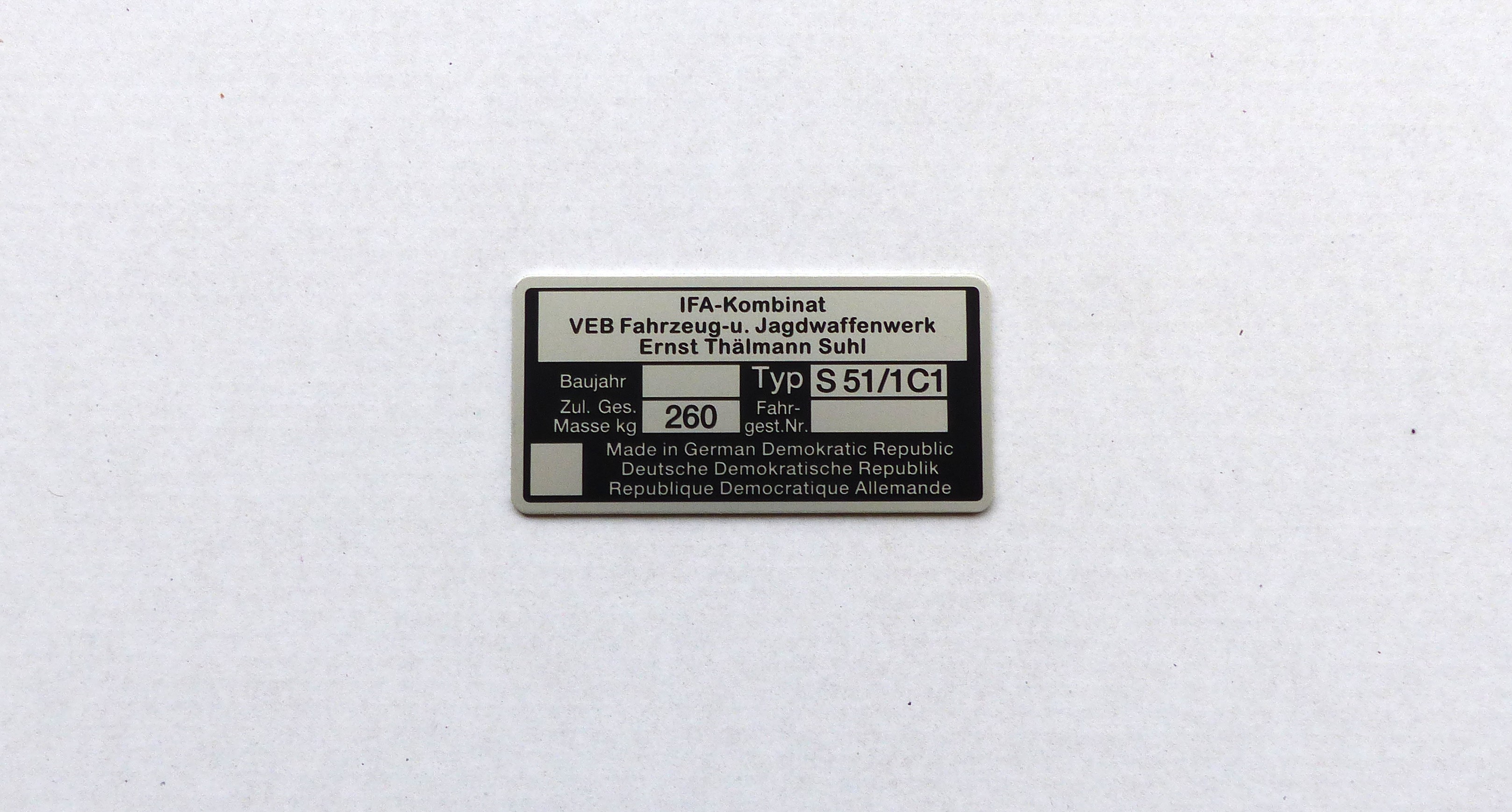 Angeboten wird ein geätztes Typenschild passend für die Simson S51/1C1 aus Aluminium mit den Feldern:
