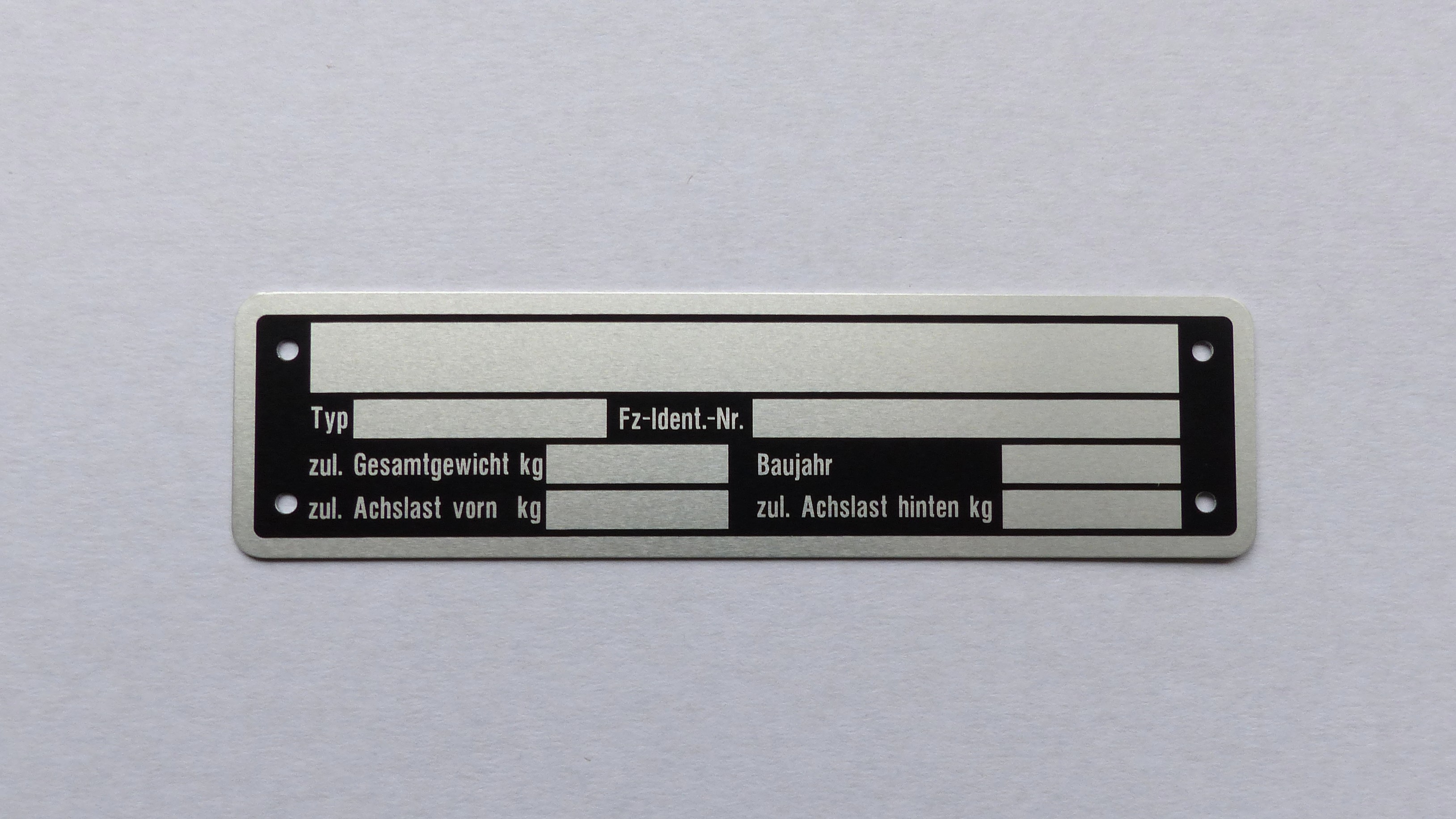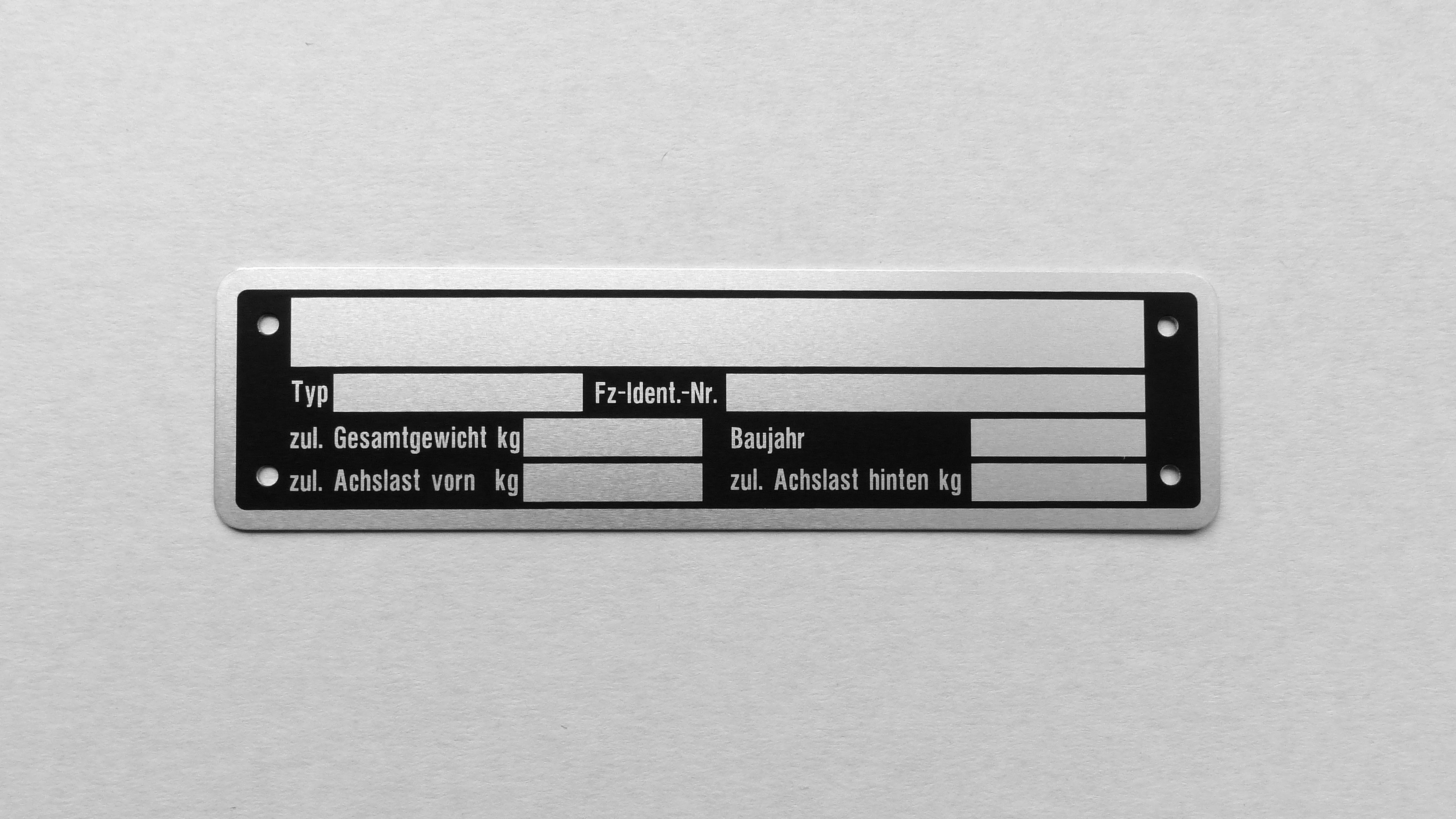 Angeboten wird ein blanko Typenschild für Kfz Anhänger und Autos mit 2 Achsen aus eloxiertem Aluminium mit den eintragbaren Schriftfeldern:
